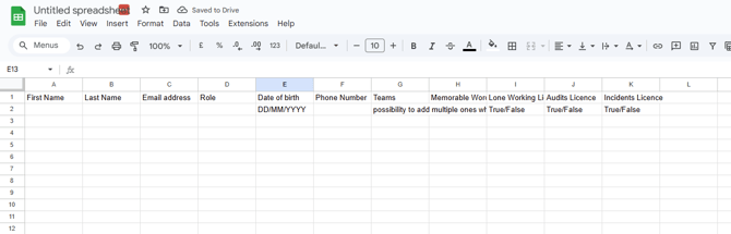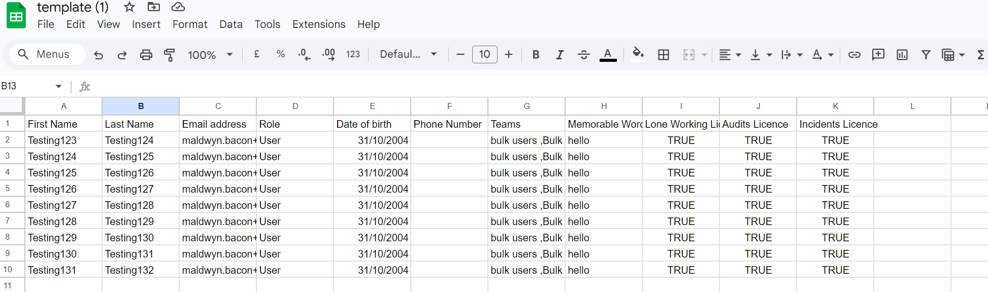 Compare your template with the example below, which has the mandatory fields filled in. This template is set up to create 9 users, with the teams 'bulk users' and 'Bulk extra' assigned, along with the licences for Lone Working, Incidents and Audits.