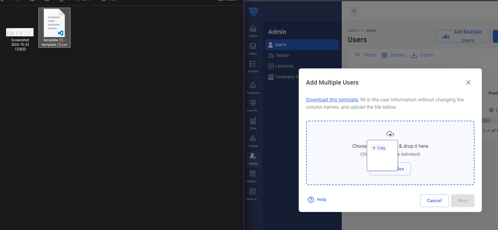 Once completed, save this file as a CSV and then drag and drop it into the upload box. Once it has been uploaded, click 'Next'.