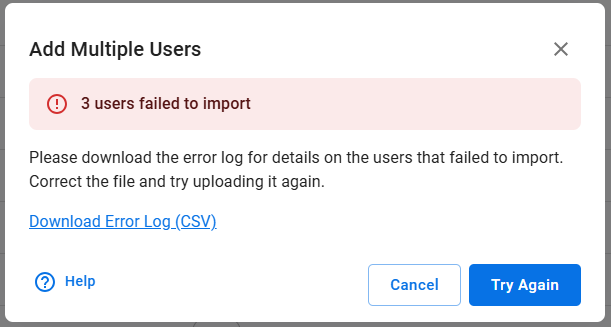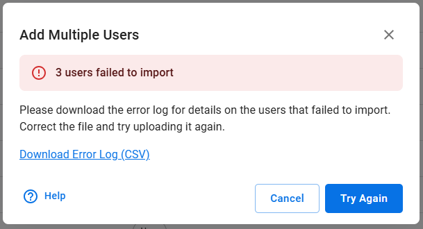 If you receive an error message stating that the upload has not been successful ('users failed to import'), you will have to adjust the information on the .csv file you uploaded and try again.