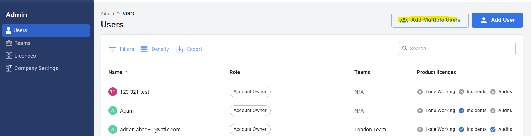 Click on the 'Add Multiple Users' button on the top right-hand side of the screen.