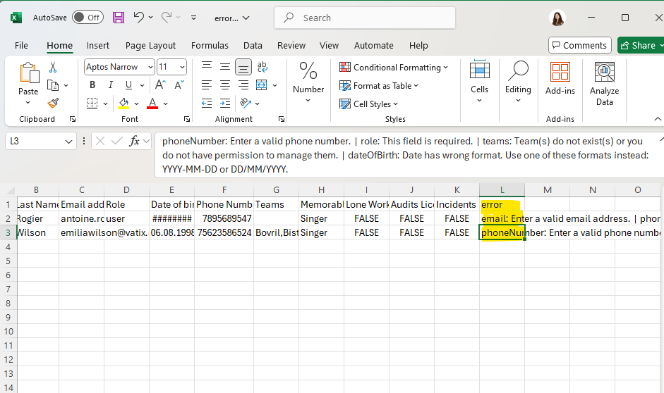 In the example above, for 'Emilia Wilson' the error log is telling me that I have entered an invalid phone number, because I have entered too many digits.