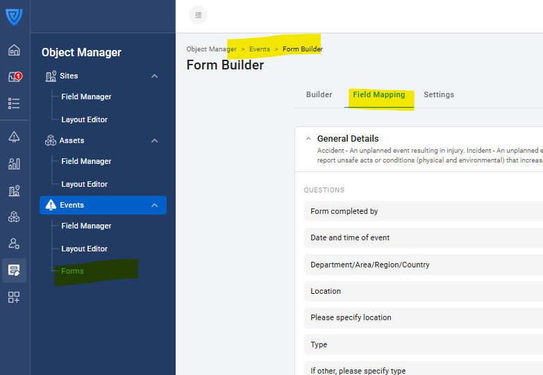 To ensure data from your forms appears correctly in reports and dashboards, each form question must be linked to a corresponding field in the Object Manager. For the mapping to work correctly: