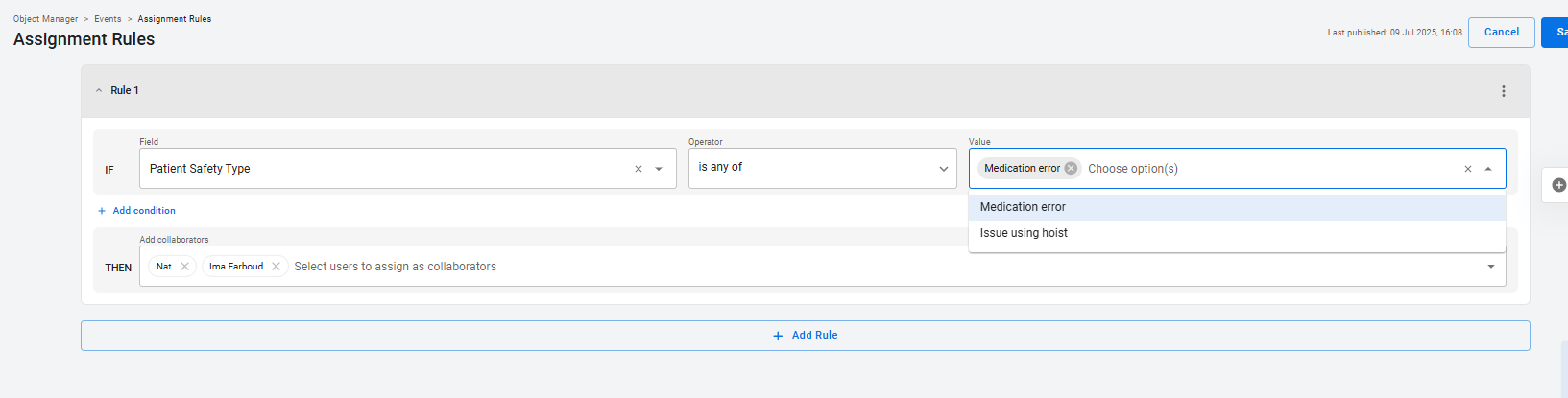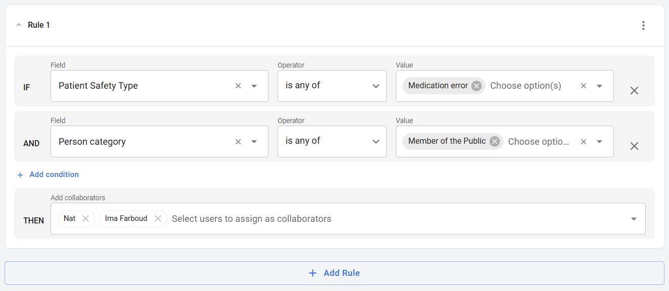 You can add more than one condition to a rule. For example, if there is a subset of people who only need to be added as a collaborator when the Patient Safety Type = Medication Error AND when Severity = Severe, you can add this as a condition: