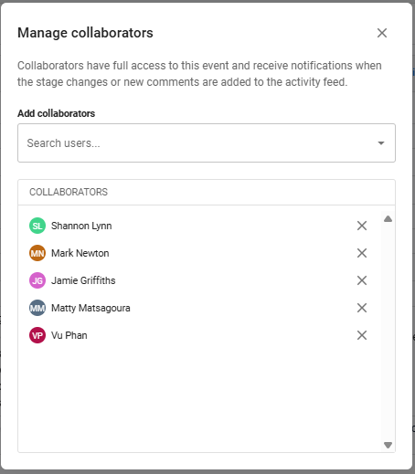 Collaborators are users who are given full access to an Event record.