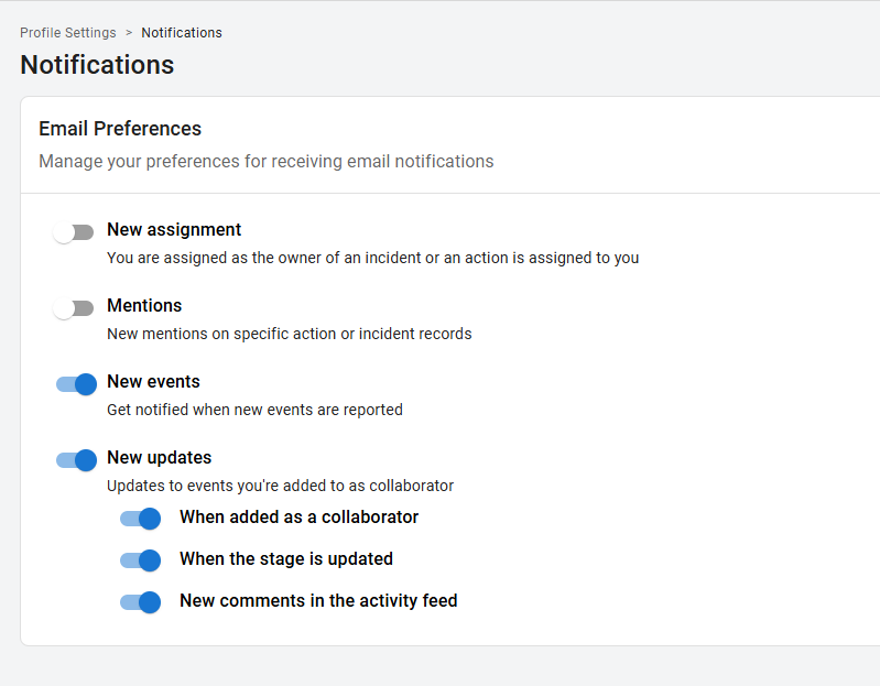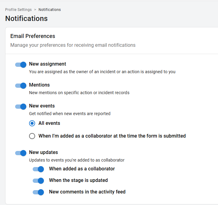 Account Owners can choose to receive notifications for all events reported in the organisation or only for events where they are added as a collaborator through assignment rules.