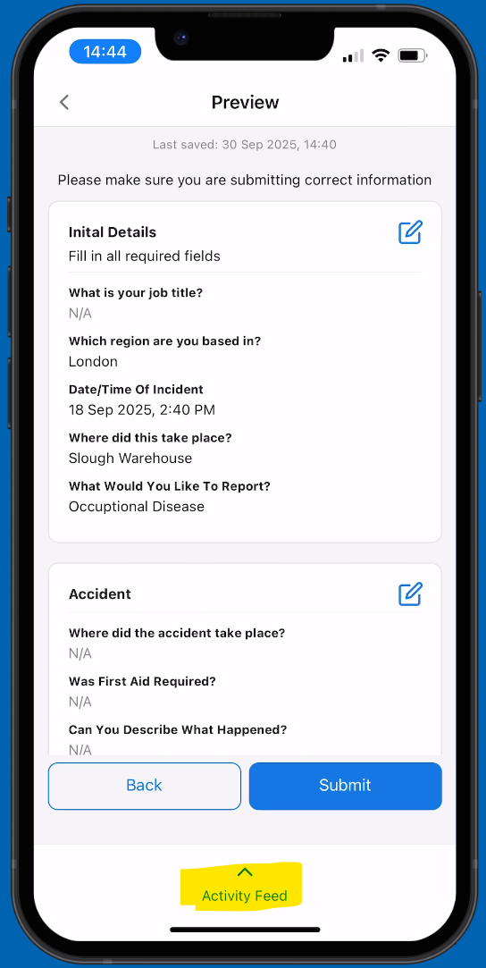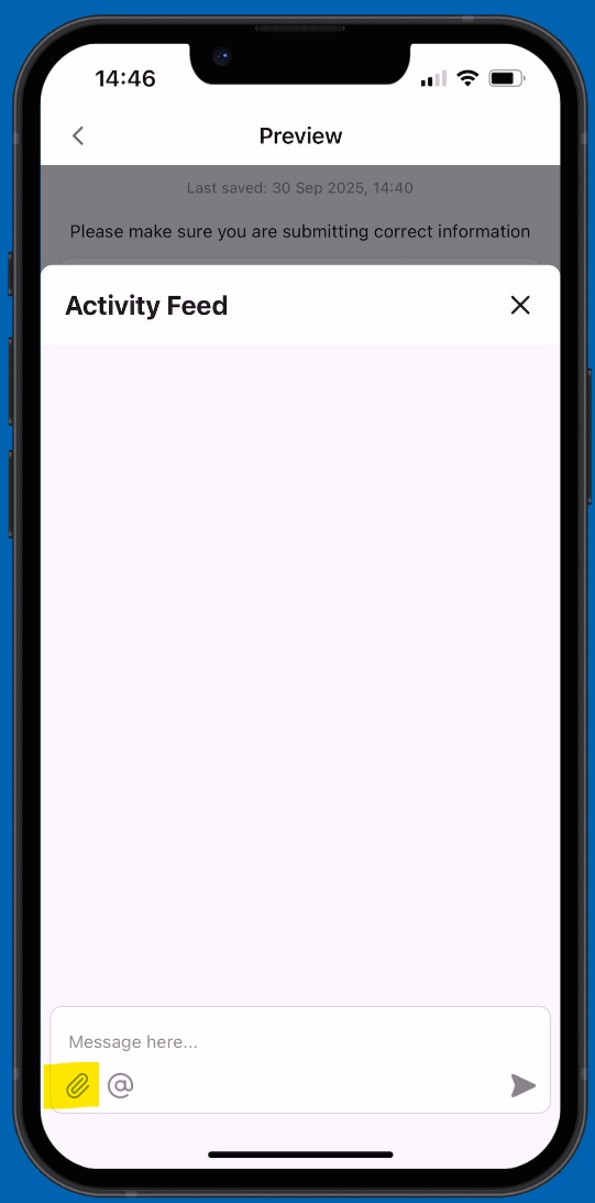 Once you have filled in all the questions, you will be taken to the final page where you can review your responses. From here you can add additional comments and upload documents and pictures by clicking 'Activity Feed'. Tap on the paper clip icon to add files and pictures.