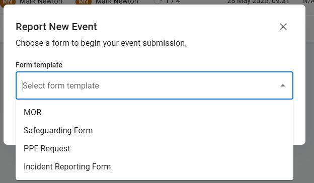 Click 'Report Event' in the top right. Your organisation may have more than one form available to select. If you do not see the form you need in the preview drop-down menu, type in the box, and it will appear.