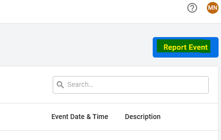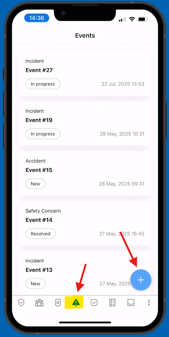 Click on the Events tab and select the blue plus icon to report a new event.