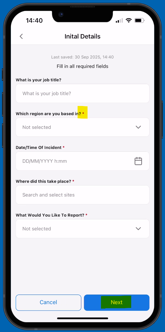 Your organisation may have more than one form available. Select the one that matches what you need to report and fill in the form. Ensure that all the required fields are completed (the required fields are marked with a red asterisk).