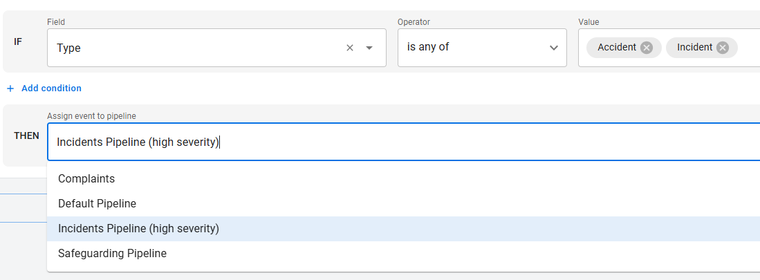 5. In the Then section, select the pipeline the event should be assigned to when this condition is met.