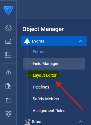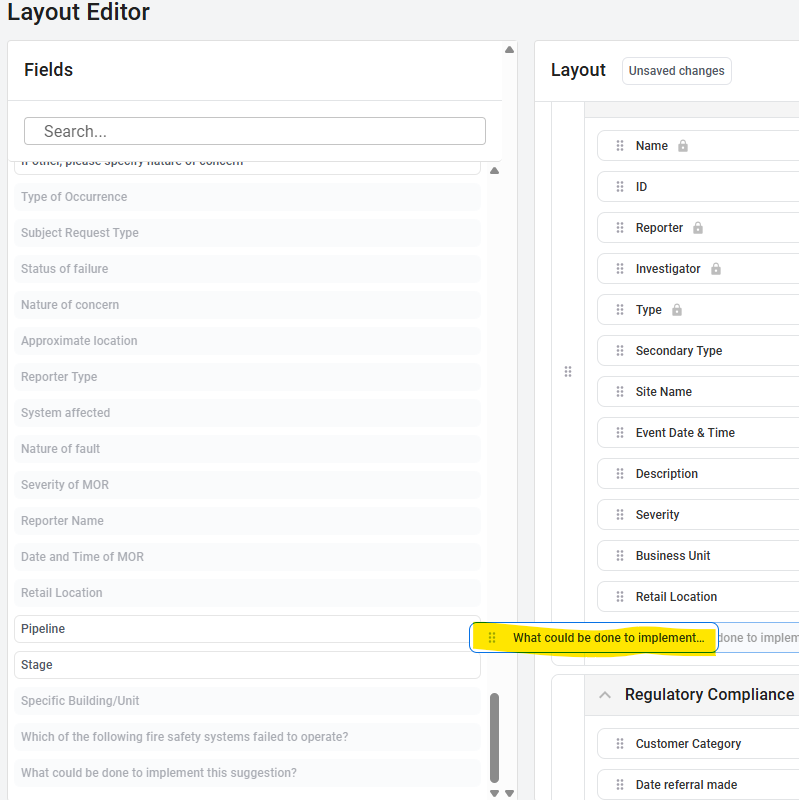 Tip: Group related fields together so the record remains easy to navigate. For example, place investigation-related fields in the “Investigation” section.