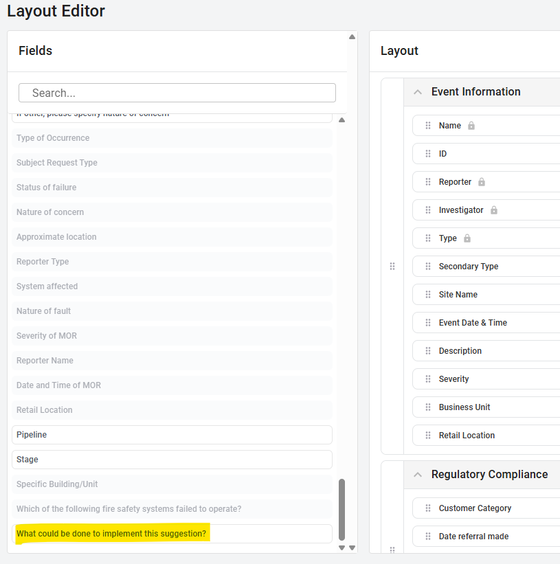 Once a new field is created, it needs to be added to your layout so it appears in the Event Record, and included in the relevant pipeline stages so users can see and complete it during the follow-up process.