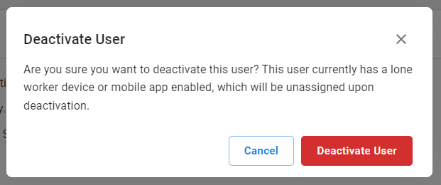 To confirm, click 'Deactivate User'. This will automatically unassign their product licence and free this up for other users. If they have a mobile app licence or Safe Pro device assigned to them, these will also automatically be unassigned. It will also remove their phone number so it can be used for other users.