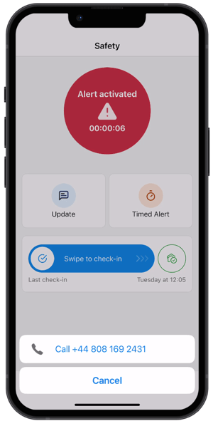 2. Your phone will prompt you to initiate a call with our Alarm Monitoring Centre or the escalation contacts determined by your system administrator (this depends on whether you have Vatix 24/7 Monitoring or Self-Monitoring). Even if the alert was raised accidentally or for testing purposes, it is critical to complete the phone call once an alarm is raised, so that the responders can check that you are safe and close down the alert.