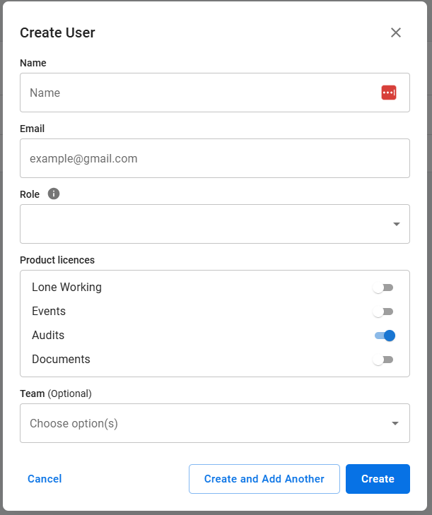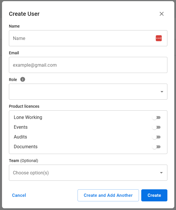 3. Fill in the details required, selecting the appropriate role for that user, depending on whether they will be a User, Manager, or Account Owner. This will determine their user permissions (the level of access to information and what they can do on the platform). Select the product licences according to what you have purchased. If you have already created Teams, you can add them to a Team, but this can also be done later.