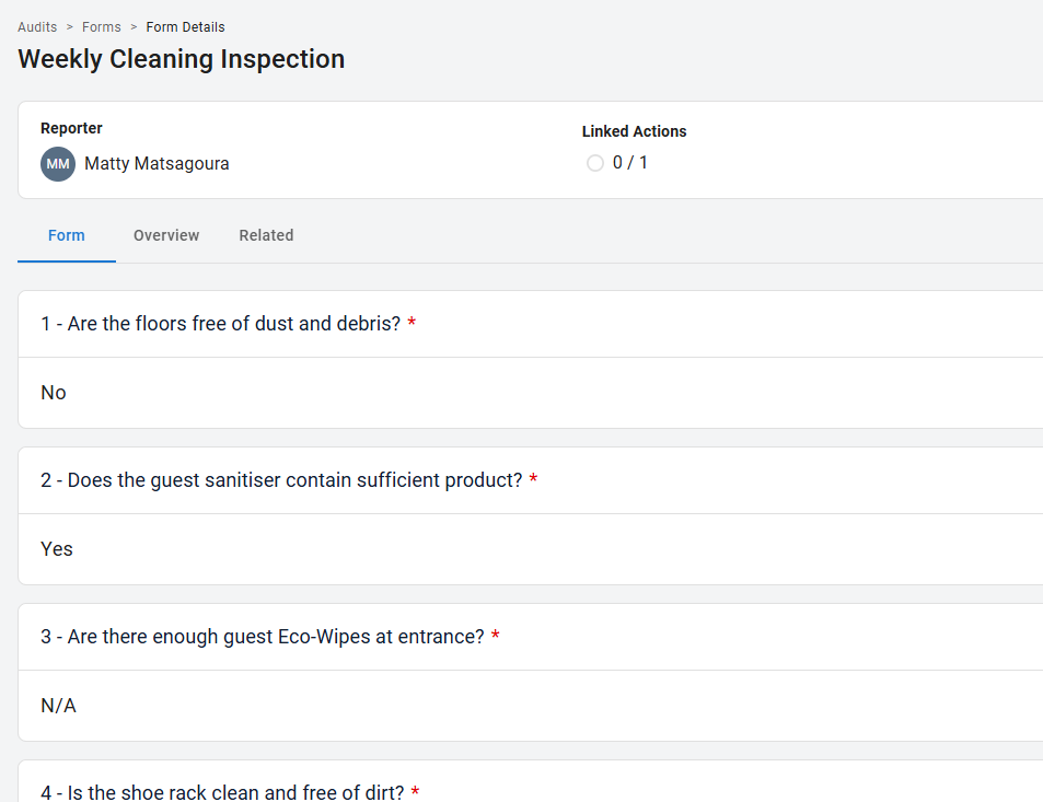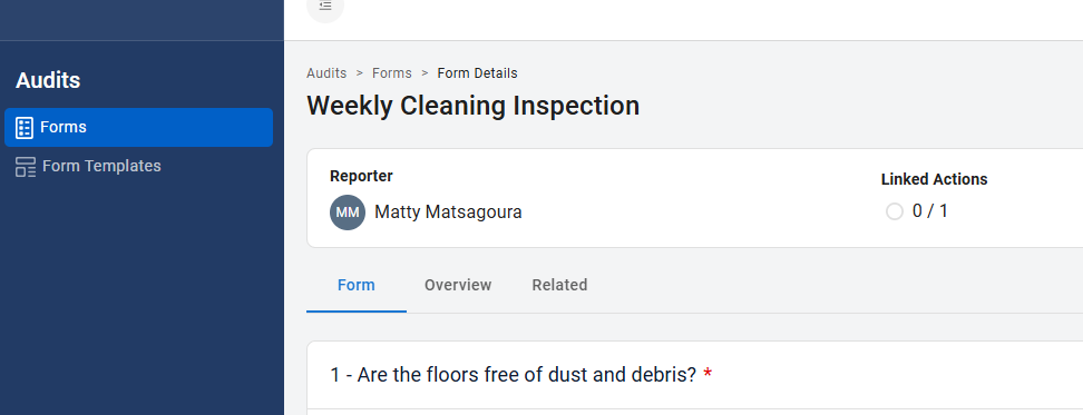 This article explains how to fill in an inspection form on the Audits web application. To see how to complete a form on the Vatix mobile app, click here.