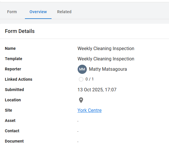 The Overview Tab will give you details about the form, such as the reporter and when it was submitted. You can edit some of these fields using the 'Edit' button in the top right of the Form Details box.